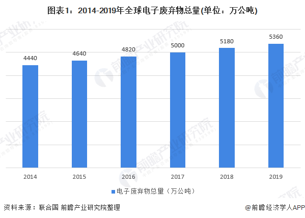 2014-2019年,全球电子废弃物总量不断增加?!?020年全球电子废弃物监测》报告显示,2019年全球产生的电子废弃物(带电池或插头的废弃产品)总量达到了创纪录的5360万公吨。