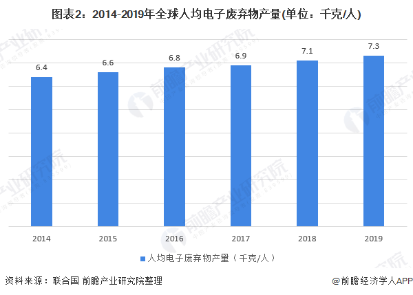 从人均电子废弃物产量来看,2014-2019年全球人均电子废弃物产量逐年增加,2019年达到7.3千克/人。